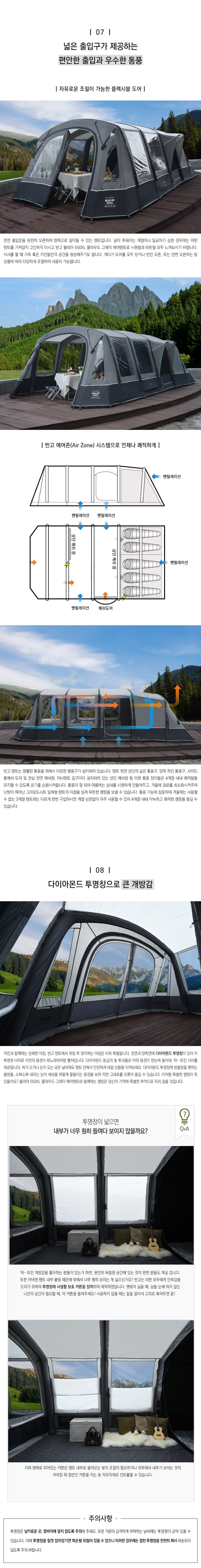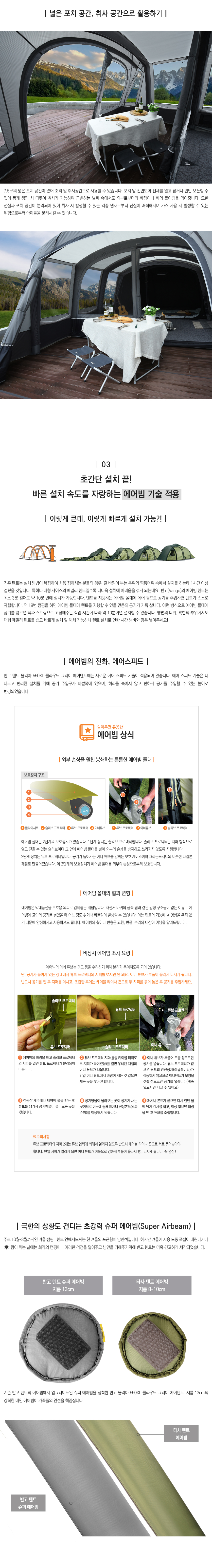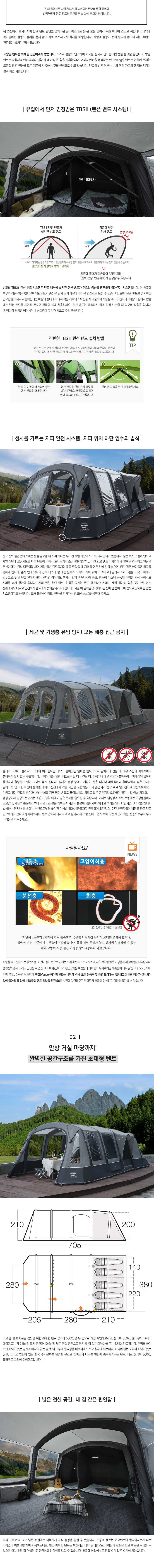 Á¾·á: 5ÀÎ¿ë ¿¡¾îºö ÅͳÎ(Airbeam Tunnel)ŸÀÔ ´ëÇü Ä·ÇÎ ÅÙÆ®¼³Ä¡½Ã°£: 12ºÐ(¹Ý°í Ä«´Þ·Î±× ±âÁØ)ÀçÁú: ÅÙÆ® = ´õºí ¸³½ºÅ¾ ¼¾Æ¼³Î ÇÁ·Î(106g/m2)À̳ÊÅÙÆ® = Åë±â¼º ¹æ¿° Æú¸®¿¡½ºÅ׸£±×¶ó¿îµå½ÃÆ® = ¹æ¼ö ¹æ¿° Æú¸®¿¡Æ¿·»Æú´ë = ½´ÆÛ ¿¡¾îºö(Super Airbeam)±×¶ó¿îµå½ÃÆ®: ÀÏüÇü(Sewn-in)¸Þ½¬Ã¢, µµ¾î: ÅÙÆ® ÃâÀÔ¹® - Àü¸é 1°³, Ãø¸é(Åë¸Þ½¬) 1°³³»ºÎ ÃâÀÔ¹® - Àü¸é(»ó´Ü¸Þ½¬) 1°³À̳ÊÅÙÆ® ÃâÀÔ¹® - Àü¸é(»ó´Ü¸Þ½¬) 1°³º¥Æ¿·¹ÀÌ¼Ç - Ãø¸é(ÇÏ´Ü) 3°³, Èĸé(»ó´Ü) 1°³Åõ¸íâ: Åõ¸íâ 9°³¼ÒÆîģũ±â: Æò¸éµµ Âü°íº»Ã¼ - 380(°¡·Î) x 705(¼¼·Î) x 210(³ôÀÌ)cmÀ̳ÊÅÙÆ® - 360(°¡·Î) x 210(¼¼·Î) x 200(³ôÀÌ)cmÀü½Ç - 10.6§³(³ÐÀÌ)¼ö³³Å©±â: 76.5(°¡·Î) x 53(¼¼·Î) x 51(³ôÀÌ)cm(½ÇÃø±âÁØ)¹«°Ô: 35.6kg(½ÇÃø±âÁØ, Æå, ·Ñ·¯ ¹é, ÆßÇÁ Á¦¿Ü)¹æ¼ö±â´É: ÇöóÀÌ½ÃÆ® 6,000mm / ±×¶ó¿îµå½ÃÆ® 10,000mm¹æ¿°±â´É: ÅÙÆ®, ¸Þ½¬, À̳ÊÅÙÆ®, ±×¶ó¿îµå ½ÃÆ® ¸ðµÎ EN5912À¯·´±Ô°ÝÀ¸·Î ¹æ¿°(Åõ¸íâ Á¦¿Ü)Àڿܼ±Â÷´Ü: ¸ÞÀÎ ¿ø´ÜÀÌ UPF50+ ÀÌ»ó¹æÇ³±â´É: TBS II ÅÙ¼Ç ¹êµå·Î °·ÂÇÑ ¹æÇ³È¿°ú ¹ßÈÖ¹æÃæ±â´É: ¹Ù´Ú ÀÏü ¹× ¸Þ½¬µµ¾î·Î ¹æÃæ±â´É¹æÇѱâ´É: ¹Ù´Ú ÀÏüÇüÀ¸·Î ´Ü¿, ³¹æÈ¿À² ÃÖ°í¹æ¿À±â´É: ¹Ù´Ú ÀÏüÇüÀ¸·Î Èë, ÆÄ¼â¼®À¸·ÎºÎÅÍ ÅÙÆ® ³»ºÎ ¿À¿° ¹æÁöÀû¿ë±â¼ú: ¿¡¾îºöÀÇ ÁøÈ ´º ¿¡¾î½ºÇÇµå ½Å±â¼ú Àû¿ë½´ÆÛ ¿¡¾îºö(Super Airbeam) ±â¼ú Àû¿ëÀ¸·Î °ß°íÇÔ À¯Áö°Ç³¿¡µµ ÅÙÆ® Áß½ÉÀ» °ß°íÇÏ°Ô Àâ¾ÆÁÖ´Â TBS II ÅÙ¼Ç ¹êµåƯ¡:ÅëdzÀ» ¿øÈ°ÇÏ°Ô ÇÏ´Â ¹Ý°í ¿¡¾îÁ¸(AirZone) ½Ã½ºÅÛ- ¹Ù´ÚÀÌ ¾ø´Â Æ÷Ä¡ °ø°£, ÀÖ´Â Àü½Ç°ø°£, ¾È¹æ°ú °Å½Ç ±×¸®°í ¸¶´ç±îÁö- Äý(Queen) º£µå·ëÀ¸·Î 1Àδç 60cmÀÇ ÃæºÐÇÑ ¼ö¸é °ø°£ Á¦°øÅÙÆ® Çϳª¿¡ ±¸ºñµÈ Çѱ¹ °ÅÁÖ ¹®È¸¦ ¹Ý¿µÇÑ ´ëÇü ÆÐ¹Ð¸® ÅÙÆ®- ÃÑ 2°³ÀÇ ÃâÀÔ±¸·Î µå³ªµêÀÌ Æí¸®ÇÏ¸ç ¿øÈ°ÇÑ Åëdz °¡´É- Àڿܼ±À¸·ÎºÎÅÍ ÅÙÆ®¸¦ º¸È£ÇÏ´Â Ä÷¯¶ô(ColourLok¢â) ±â¼ú Àû¿ë- ¾îµÎ¿î Ä÷¯ÀÇ À̳ÊÅÙÆ®, ¹Ìµå³ªÀÕ(Midnight) º£µå·ëÀ¸·Î ¿ÜºÎÀǹàÀº ºûÀ» ¾îµÓ°Ô Á¶ÀýÇÏ¿©ÁÖ¾î ¼÷¸éÀ» ÃëÇÒ ¼ö ÀÖÀ½- Åõ¸íâ¿¡ »ç»ýȰ º¸È£ Ŀư ó¸®- °³Æó½Ä À̳ÊÅÙÆ® ĸ·ÀÌ·Î °£ÀÌ Å»ÀǽÇÀ̳ª °³ÀÎ ¹æÀ¸·Î Ȱ¿ë °¡´É- ·£ÅÏ, ÇàÀ× ½ºÅ丮Áö ¶Ç´Â Ãß°¡ÀûÀÎ ¹°Ç° µîÀ» °É ¼ö ÀÖ´Â- 9°³ÀÇ ´ÙÀ̾Ƹóµå Åõ¸íâÀ¸·Î ½Ã¿øÇÑ Àü¸Á ¹× ¶Ù¾î³ °³¹æ°¨ Á¦°ø´º ½ºÄ«ÀÌ Æ®·¢ ½Ã½ºÅÛ ÀåÂø- Àü±â ÄÉÀ̺íÀ» ÆíÇÏ°Ô ²ø¾î¿Ã ¼ö ÀÖ´Â ÄÉÀÌºí »ðÀÔ±¸±¸¼ºÇ°: ¹Ä¸®¾Æ 550XL Ŭ¶ó¿ìµå ±×·¹ÀÌ ¿¡¾îÅÙÆ®, ·Ñ·¯ ¹é ÄÉÀ̽º,- ´Ù¾çÇÑ ¹°Ç° ¼ö³³¿¡ ¿ëÀÌÇÑ ¼ö³³ ÁÖ¸Ó´Ï- ·Ñ·¯ ¹é ÄÉÀ̽º°¡ Æ÷ÇԵǾî ÀÖ¾î ÈûµéÀÌÁö ¾Ê°í ÅÙÆ®¸¦ ¿î¹Ý °¡´É´º ´õºí¾×¼Ç ÆßÇÁ, ½ºÄ«ÀÌÈÄÅ©, °í¹«¸ÁÄ¡, ½ºÆ¿ Æå, ÆåÄÉÀ̽º